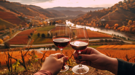 Picturesque autumn vineyard with golden and red grapevines in scenic hillside landscape