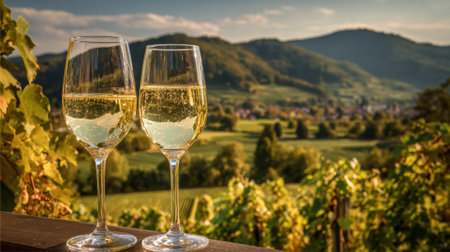 Two sparkling glasses sit on a ledge overlooking lush vineyards under a stunning sunset sky.
