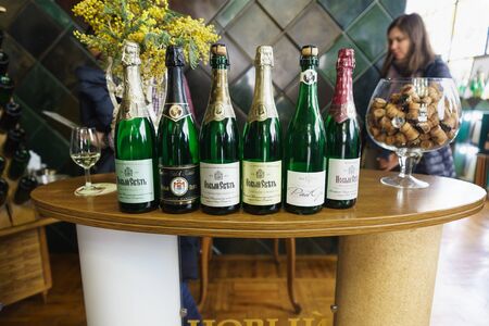 Novy Svet, Crimea, Russia - March 09, 2019: Sparkling wines of the Novy Svet plant prepared for tasting by a tourist group