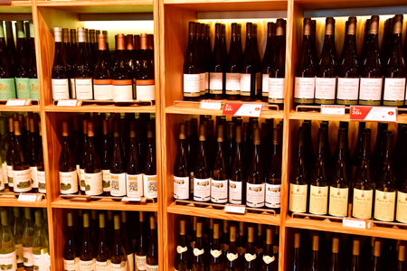 A close-up of multiple wine bottles on display in a wine shop, with neatly arranged shelves and a variety of labels and types.