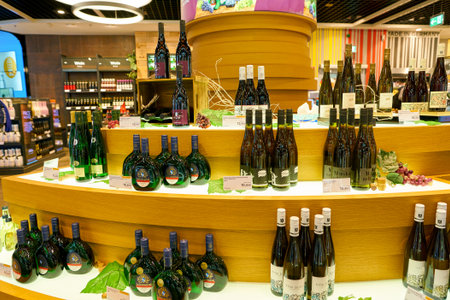 Podgorica, Montenegro - 02 july 2020: Stand supermarket with wine bottles Plantaze.