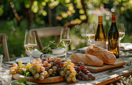 A table set with white wine, a fresh baguette, and bunches of green grapes under soft light
