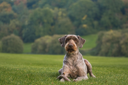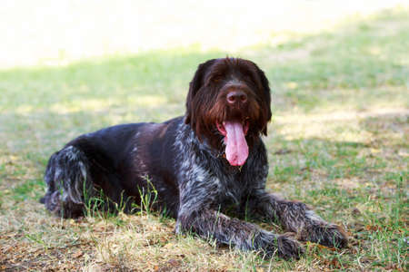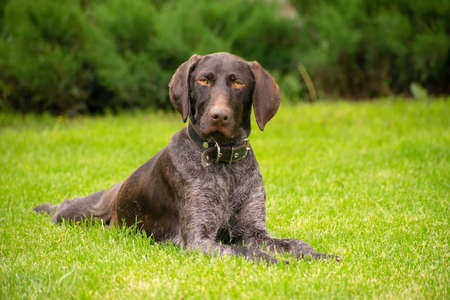 The hunting dog drathaar is lying on the green grass. Rest. Relax.