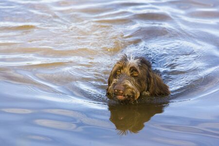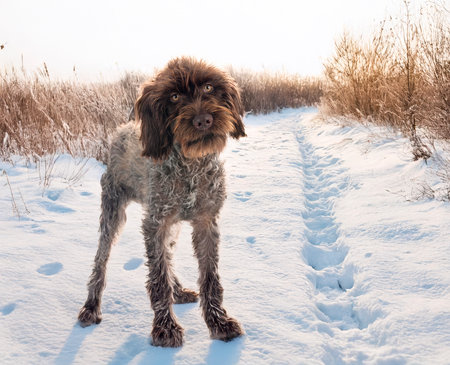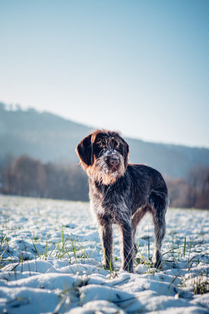 A dog that is a pointing dog in winter in its natural habitat. Drathaar in winter. High quality photo