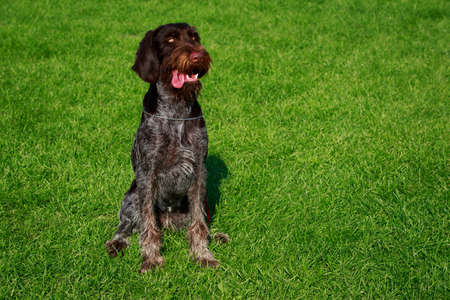 Portrait of a cute German wire-haired pointer on the green grass