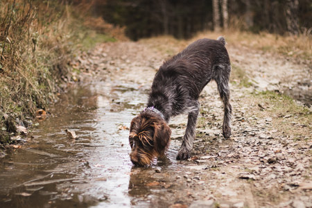 Barbu tcheque drinks water from a puddle on a forest road in the middle of the Beskydy Mountains. hunting dog is thirsty. Friend of man, faithful servant. Picture Antique White and Fortuna Gold tones.