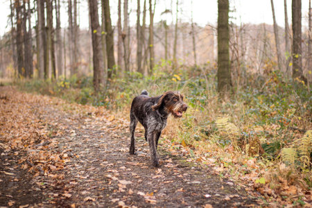 Hunting dog of the German breed Drathaar in autumn in the forest. High quality photo