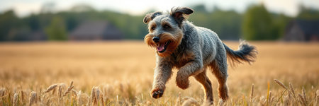 Korthals Griffon or Wirehaired Pointing Griffon running through the fields