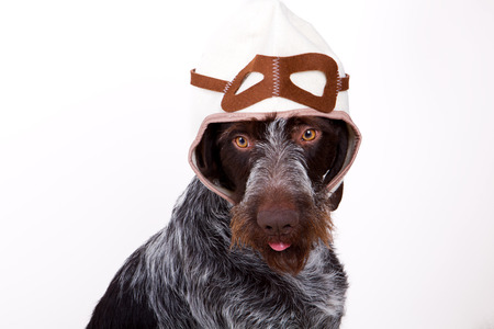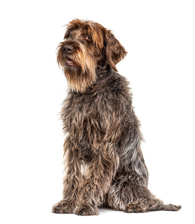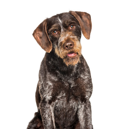 German Wirehaired Pointer also know as Drahthaar sitting against white background