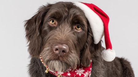 A close-up studio portrait of a brown, shaggy dog wearing a red and white Santa hat and a festive red scarf with a snowflake pattern.