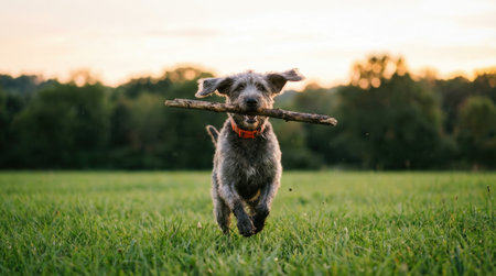 A joyful puppy dashes across a grassy lawn at golden hour. The energetic pet holds a wooden stick, its ears flying as it runs with a forest in the distance.