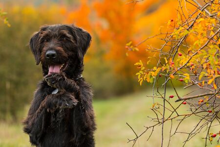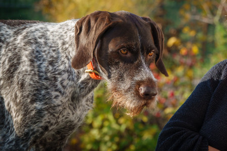 Hunting dog of the German breed Drathaar in autumn in the park outdoors on a sunny day. high quality photo