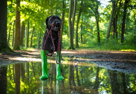 golden retriever dog in rain boots in forest puddle.