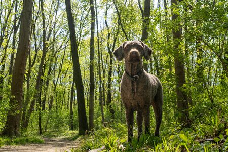 A brown spanish water dog with summer hair cut standing in the middle of the Prater dog park forest in Vienna