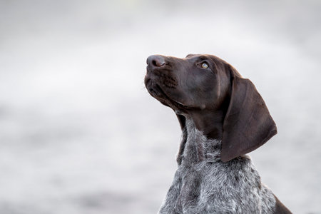 German shorthaired pointer puppy portrait in the nature. Shallow depth of field.