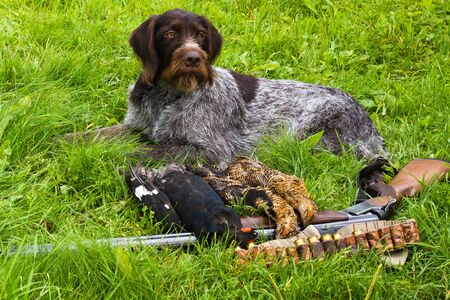 hunting dog lying on the green grass next to a shotgun and hunting trophies (three downed grouse)