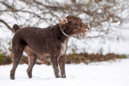 German wire-haired pointer looking in the snow.