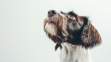 A striking portrait of a dog gazing upwards with curiosity, showcasing its expressive face and distinctive features in a clean, minimalist background. Perfect for animal lovers.