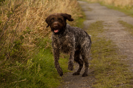 overweight old drahthaar dog for a walk.