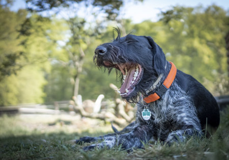 A sleepy young German Wirehaired Pointer (Deutsch Drahthaar) lying in the garden yawning