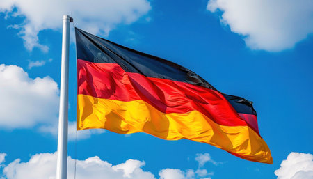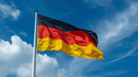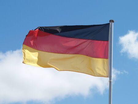 Flag of Germany waving in the wind against blue sky with white clouds