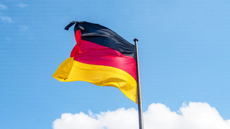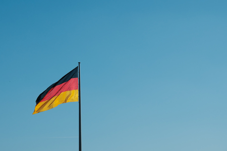 Official German flag in the wind and blue sky