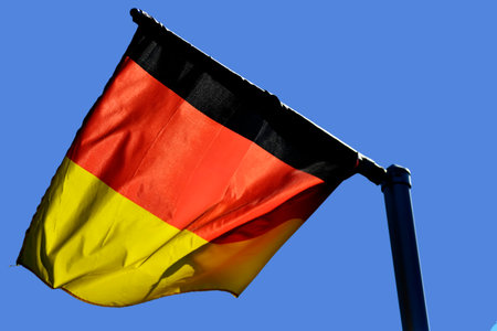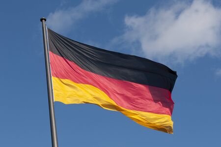 German flag waving in the wind against blue sky.
