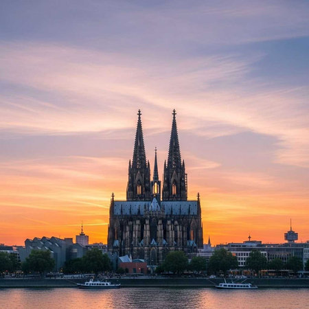 A stunning cathedral stands majestically against a vibrant sunset backdrop over a serene river
