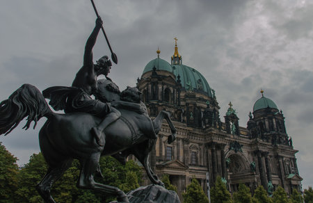 Historic architecture of the Berlin Cathedral on a cloudy day with a vibrant city atmosphere.