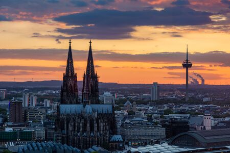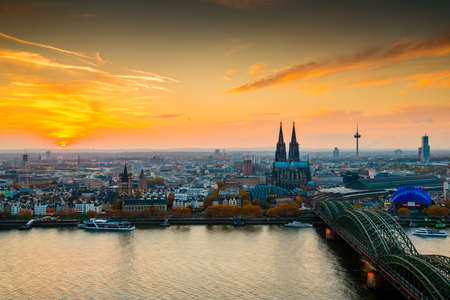 Aerial view during sunset over the city of Cologne with view to Cologne Cathedral.