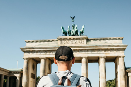 A tourist or a student with a backpack near the Brandenburg Gate in Berlin in Germany, looks at the sights.