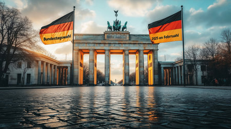 Brandenburg Gate with the national flag of Germany and the text Bundestagswaal 2025, 23 February