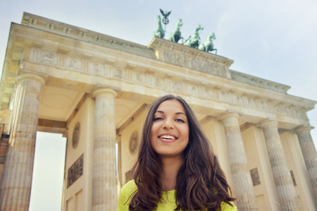 Happy smiling girl in front of Brandenburg Gate, Berlin, Germany. Beautiful young woman travel in Europe.