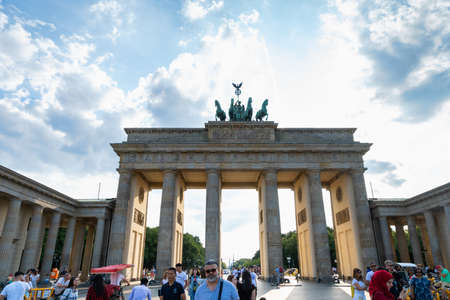 Berlin, Germany - July 2019: Brandenburg gate view and and visitors on a sunny summer day in Berlin. Brandenburg gate is one of the main landmarks in the city.