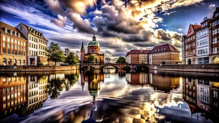 A picturesque cityscape with a canal, bridge, and historic buildings reflected in the water.