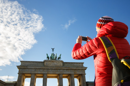 Tourist photographing Brandenburg gate, Berlin, Germany on a sunny day. City sightseeing, tourism, historical monument, cityscape concept.