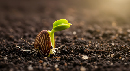 A macro shot of a germinating seed with its coat splitting to reveal a green sprout and roots entering the soil. This detailed image captures the biological process of plant birth and resilience.
