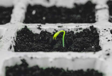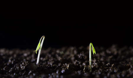 Agricultural activity, horticulture. Close-up growing sprouts cultivated in loosened black soil.