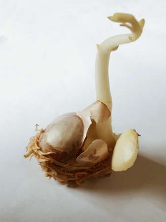 Sprouted green pea bean. A small sprout of green peas. A small green stem of sprouted green peas on a white background.
