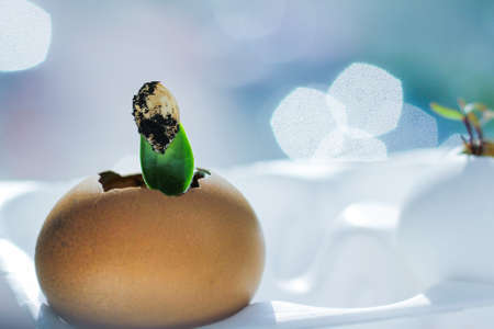 young fresh greens in a egg shell. seed sprouting. concept of awakening nature and waste-free farming.