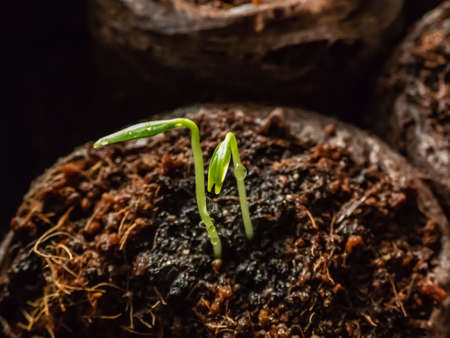 A small sprout of bell pepper sprouts in the ground. Macro