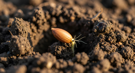 A detailed macro shot captures a single grain seed germinating in dark, fertile soil. Tiny white roots emerge from the seed, symbolizing the beginning of new life, growth, hope, and the potential within nature.
