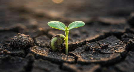 A tiny green plant pushes through the parched, dark brown soil, its delicate leaves reaching towards the soft, warm glow of the sun, highlighting themes of hope and survival.