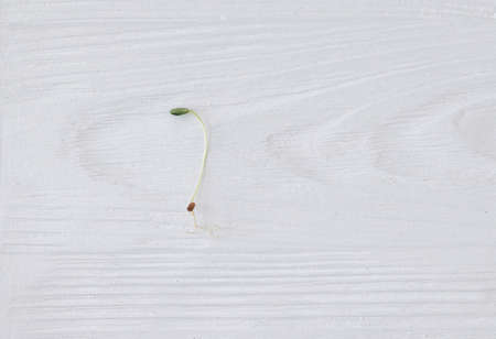 Fresh flax sprout on white wood background, top view . Flax or linen sprouter, micro green. Growing microgreens at home.