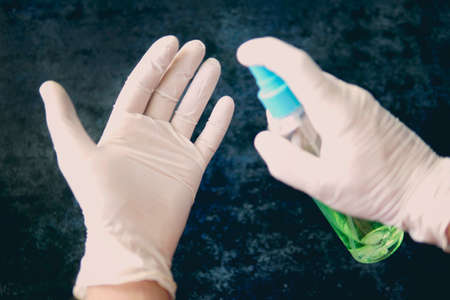 Hand with gloves holds a disinfectant dispenser and spraying on a surface.