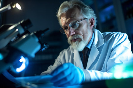 A dedicated scientist intently analyzes samples using a microscope, showcasing intense focus and professionalism in a laboratory setting. An ideal representation of science, education, and dedicated research work.