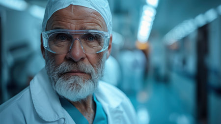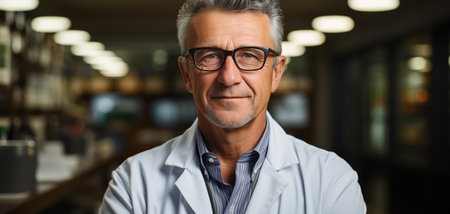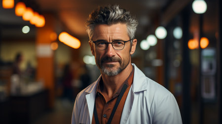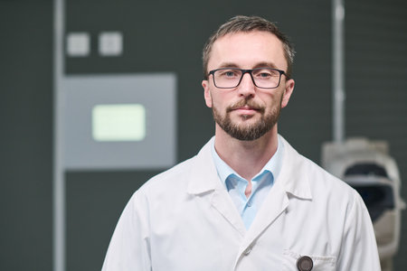 Portrait of Caucasian middle aged man wearing glasses and lab coat standing in medical facility, looking directly at camera with neutral expression, short hair and trimmed beard