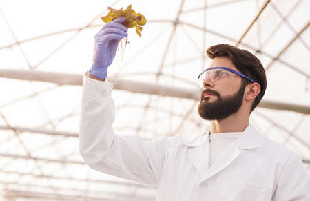 Male scientist examining plant seedling in greenhouse