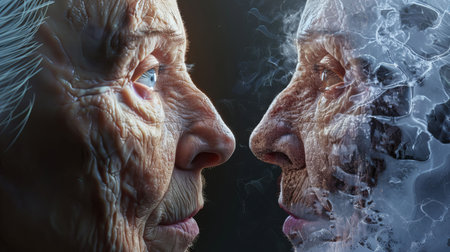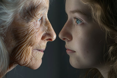 Concept of aging and skin care. Face of young woman and an old woman with wrinkles. Generative AI illustration