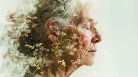 A peaceful portrait of an older woman with beautiful silver hair, deeply immersed in thought against a natural backdrop, capturing a moment of tranquility and reflection.